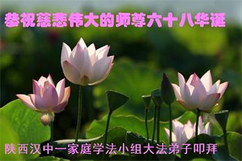 陝西省漢中一家庭學法小組大法弟子恭祝慈悲偉大的師尊六十八華誕!普天同慶第二十屆世界法輪大法日!同賀法輪大法洪傳世界二十七週年!
