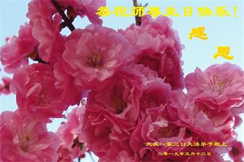 黑龍江大慶市一家三口祝慈悲偉大的師父生日快樂!感恩師父的慈悲救度,師父給予了我和媽媽健康的身體,看護著我們一家走到今天,師父的洪大慈悲時刻鼓勵著我,身在海外,我更應該多救人,紮紮實實修好自己,做一個名副其實的大法弟子。