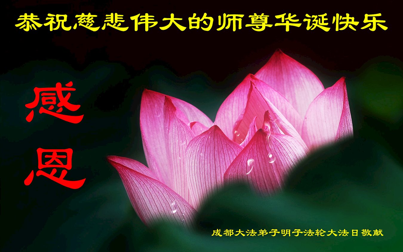 感恩師父用洪大的慈悲把我們從地獄中救出,使我們在大法中不斷的洗淨自己,用「真、善、忍」標準在指導著我們的修煉,同化宇宙的特性,在正法中做好三件事,多救人。感恩師父一路的保護,給弟子們建立威德的機會。