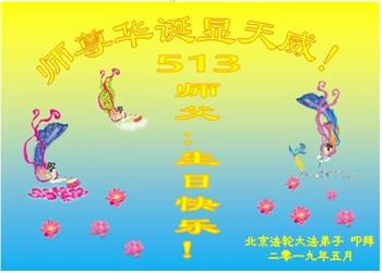 師父生日快樂!我們全體大法弟子感恩師父的慈悲救度,雖然我們做的不足,但是我們有信心做的更好。唯願師尊笑。