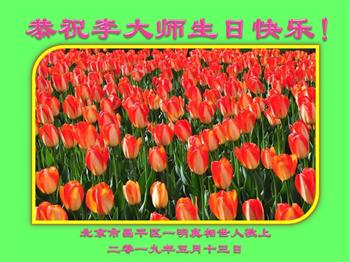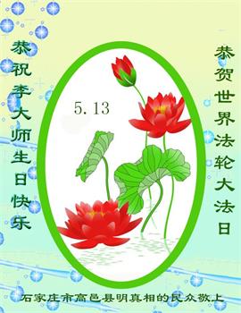 敬祝師父生日快樂!我是看過法輪功真相的平民老百姓,不是法輪功弟子,但我知道法輪大法好!我要從心底喊「法輪功萬歲萬歲萬萬歲」!我不知道怎麼樣祝願最好,我就用我內心最想說的話「法輪功萬歲萬歲萬萬歲」獻給李大師的生日!