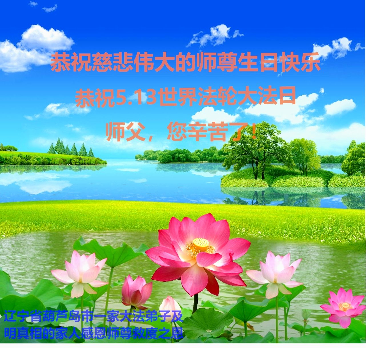 在這普天同慶的日子裏,我們大法弟子無限感恩偉大的師父慈悲救度,為我們的承受,保護我們,弟子們只有精進實修,做好三件事,圓滿隨師父回真正的家!