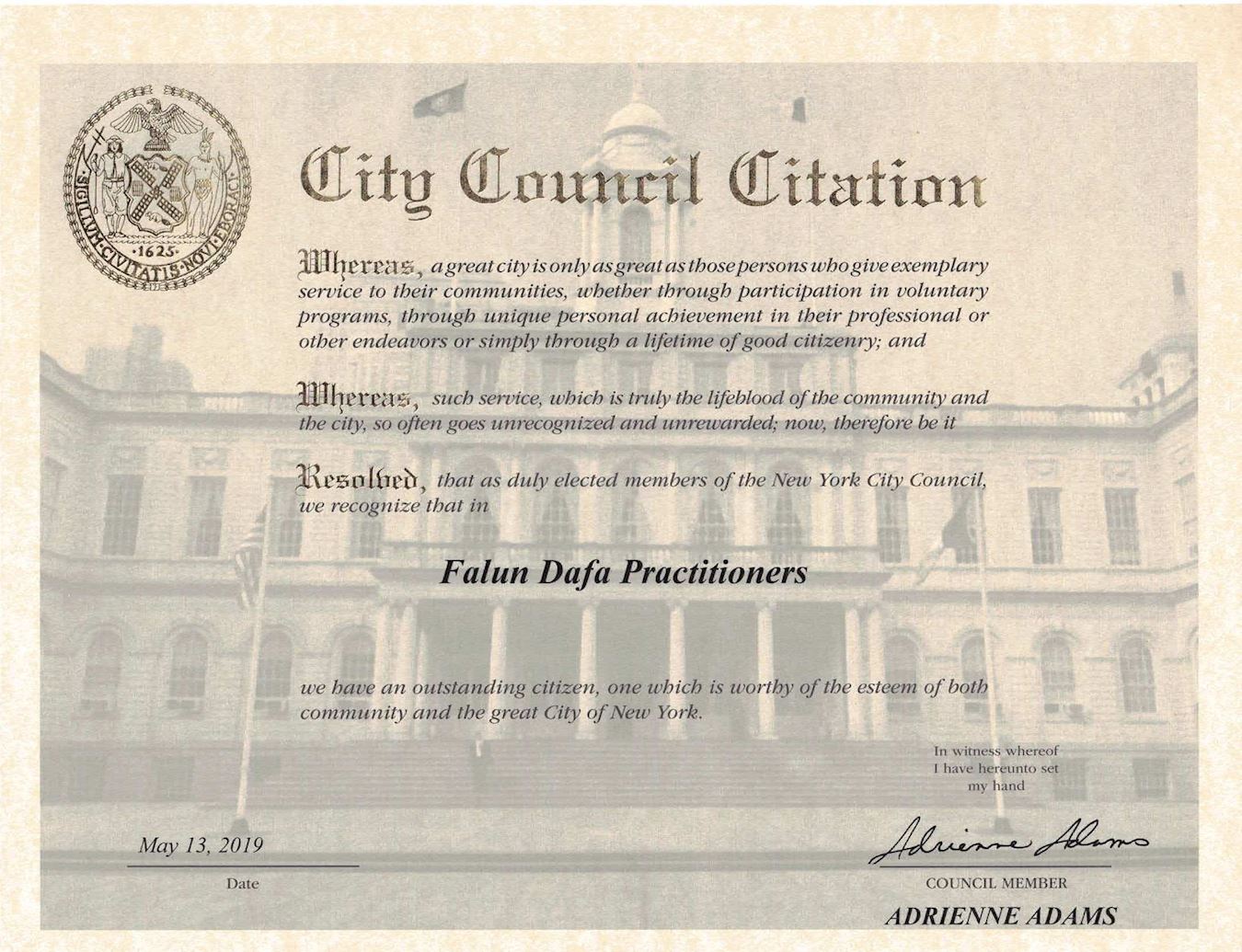 ![]() 圖3:紐約市第二十八選區市議員阿德裏安﹒亞當斯(Adrienne E. Adams)發榮譽證書讚揚法輪大法學員。 |