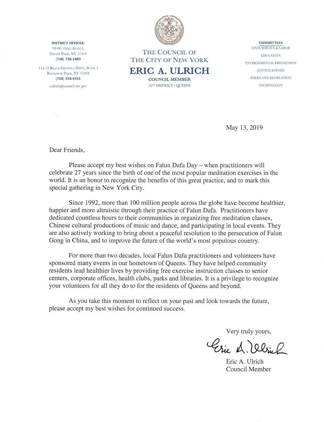 紐約市第三十二選區市議員埃裏克﹒烏爾裏希(Eric A. Ulrich)在信中寫道: