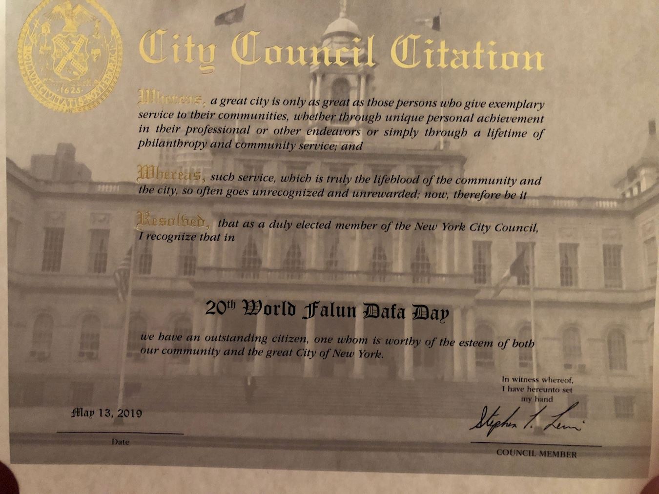 ![]() 圖5:紐約市第三十三選區市議員斯蒂芬﹒萊文(Stephen T. Levin)發來榮譽證書祝賀「第二十屆世界法輪大法日」。 |