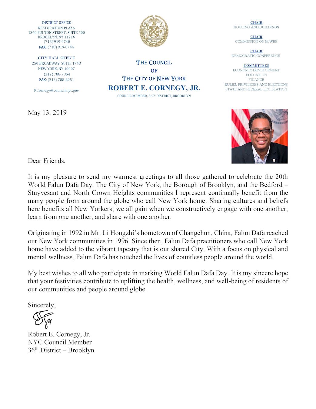 ![]() 圖6:市議員小羅伯特﹒科內吉(Robert E. Cornegy, Jr.)發來賀信,感謝大法活動使社區受益。 |