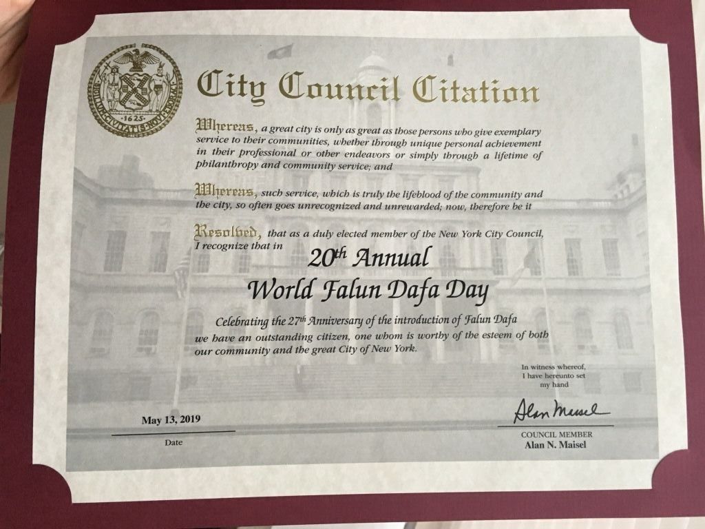 ![]() 圖7:紐約市第四十六選區市議員艾倫﹒邁澤爾(Alan N. Maisel)發來榮譽證書祝賀第二十屆法輪大法日暨大法洪傳世界二十七週年。 |