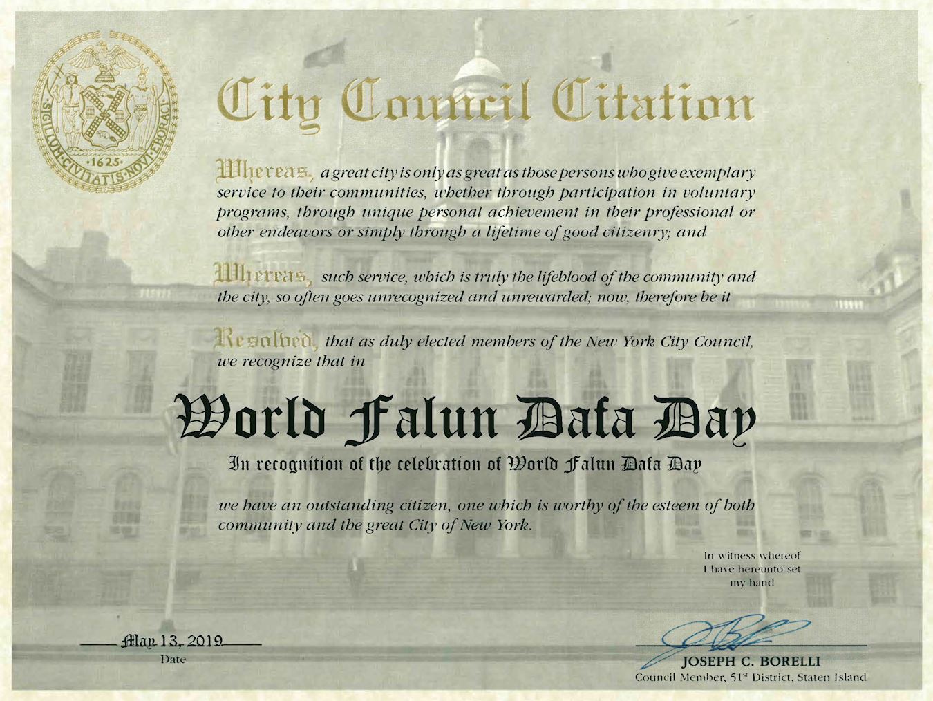紐約市第五十一選區市議員約瑟夫﹒博雷利(Joseph C. Borelli)發榮譽證書和賀信祝賀第二十屆法輪大法日,鼓勵更多人了解法輪大法。
