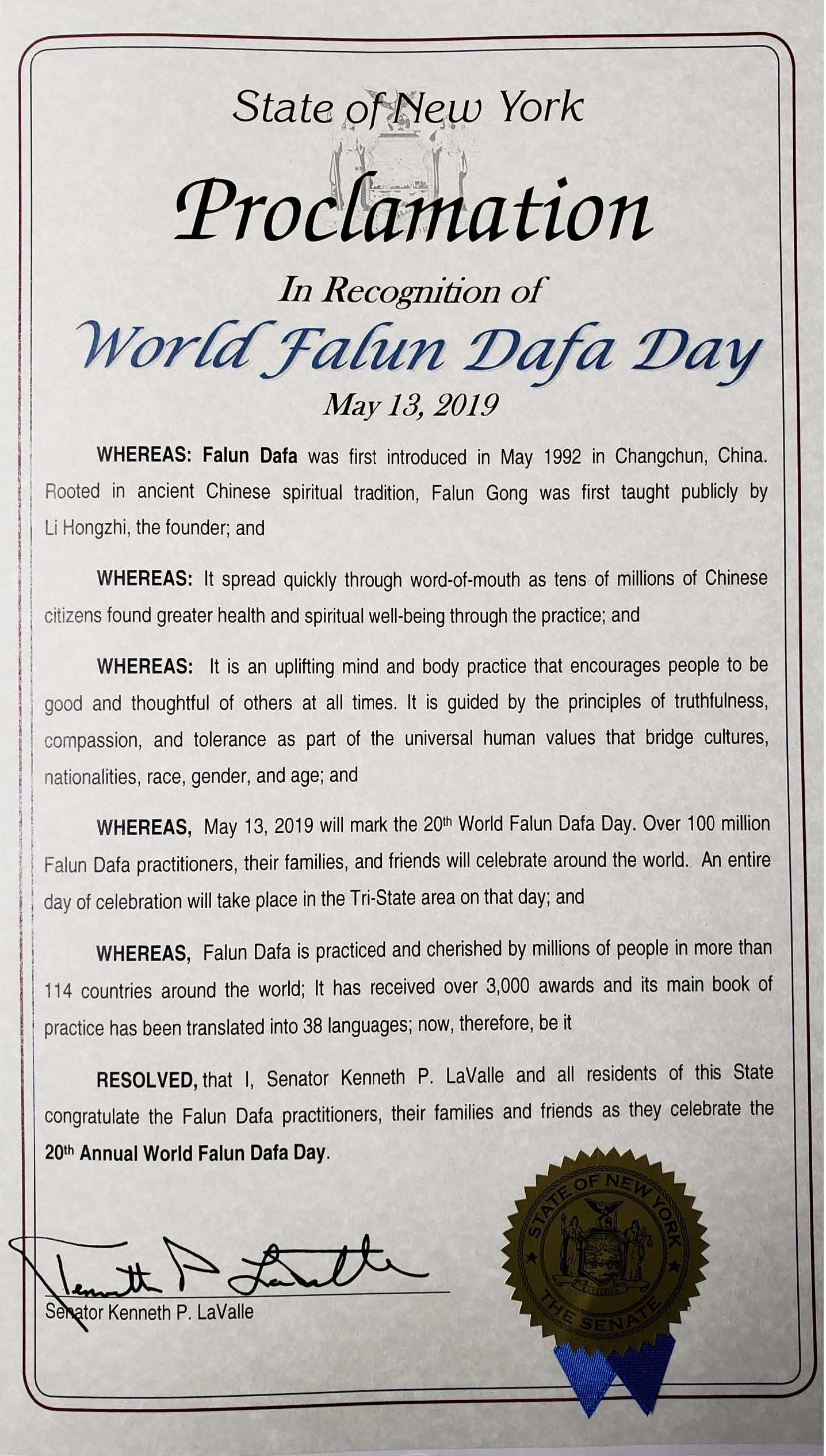 紐約州第一選區參議員肯尼思﹒拉瓦勒(Kenneth P. LaValle)發褒獎祝賀大法日。褒獎譯文如下: