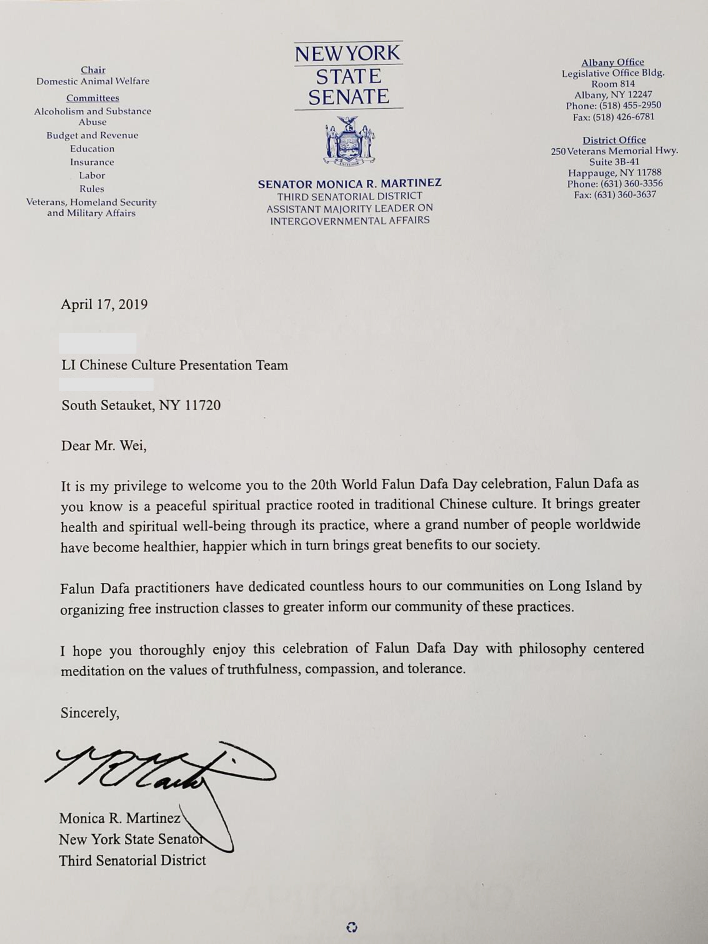 紐約州第三選區參議員莫妮卡﹒馬丁內斯(Monica R. Martinez)發賀信,祝賀大法日,信中寫道:
