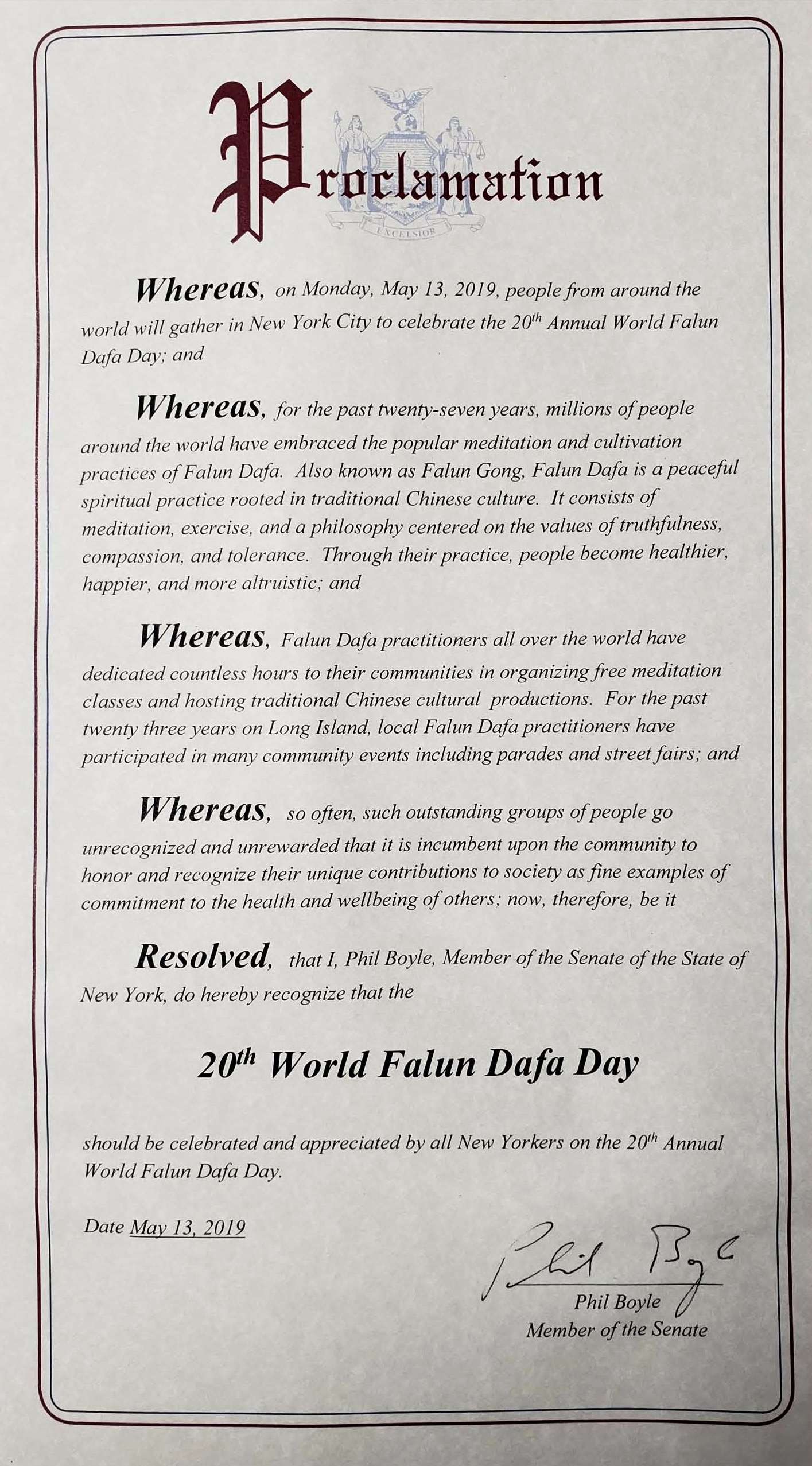 決議:我,菲爾﹒博伊爾(Phil M. Boyle),紐約州參議員,在此嘉獎「第二十屆世界法輪大法日」,應當在此日被全紐約人所慶祝。