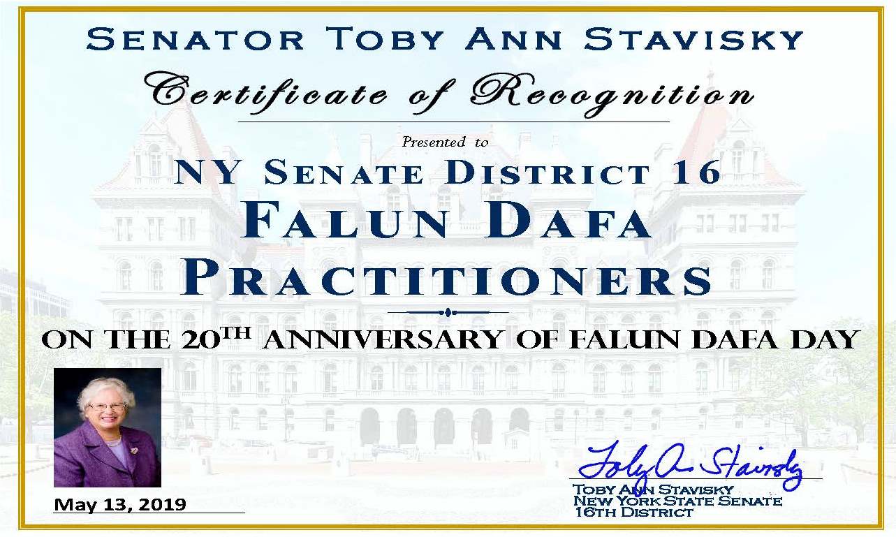 ![]() 圖5:紐約州第十六選區參議員托比﹒ 安 ﹒斯塔維斯基(Toby Ann Stavisky)發證書祝賀第二十屆法輪大法日。 |