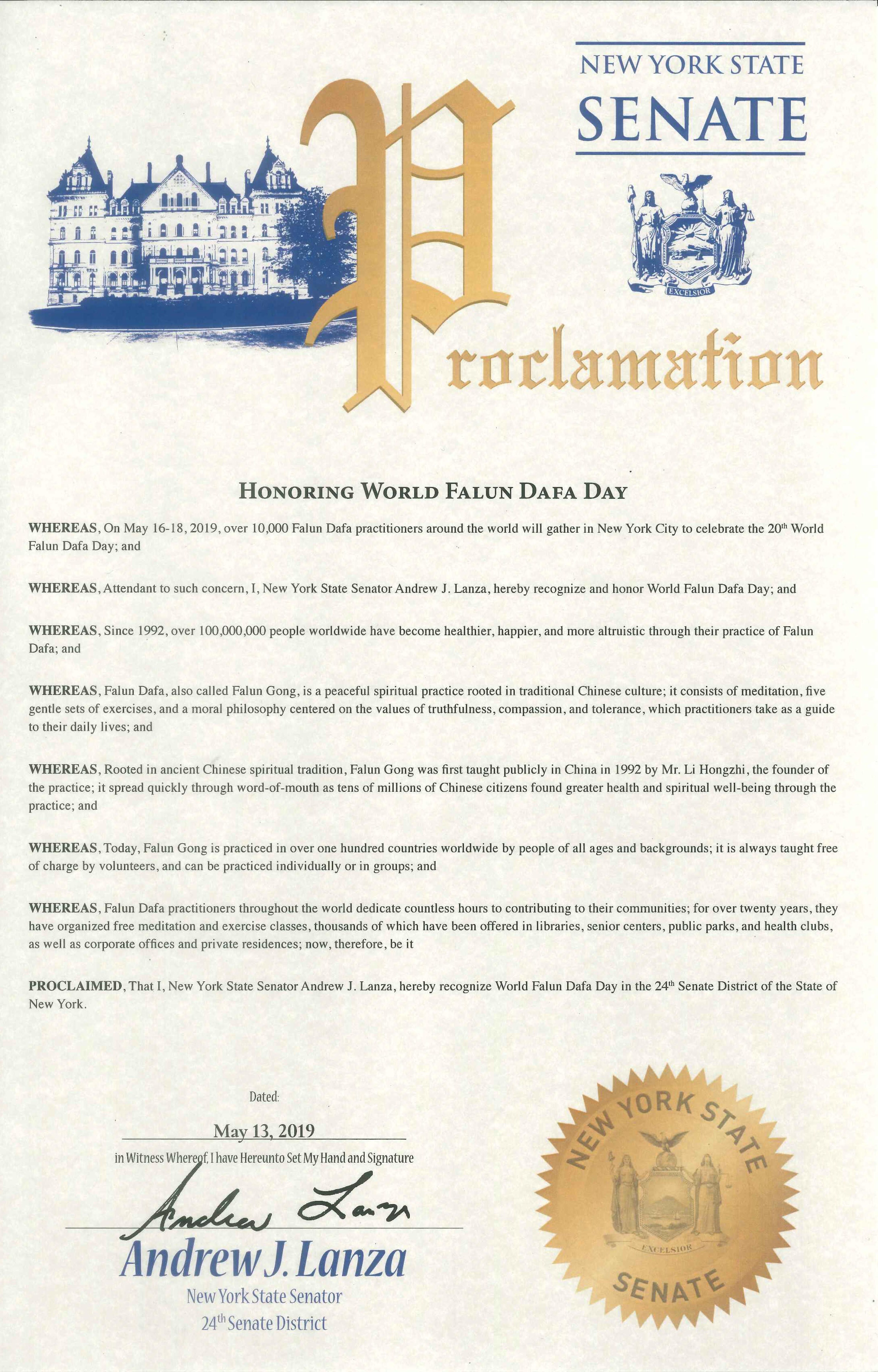 五月十六日到十八日,全世界超過一萬名法輪功學員會齊聚紐約,慶祝第二十屆世界法輪大法日。我,紐約州參議員安德魯﹒蘭札(Andrew J. Lanza),對這個節日表示認可和祝賀。自從一九九二年,法輪大法傳出,全世界有超過一億人通過修煉,變的更加健康、快樂和無私。