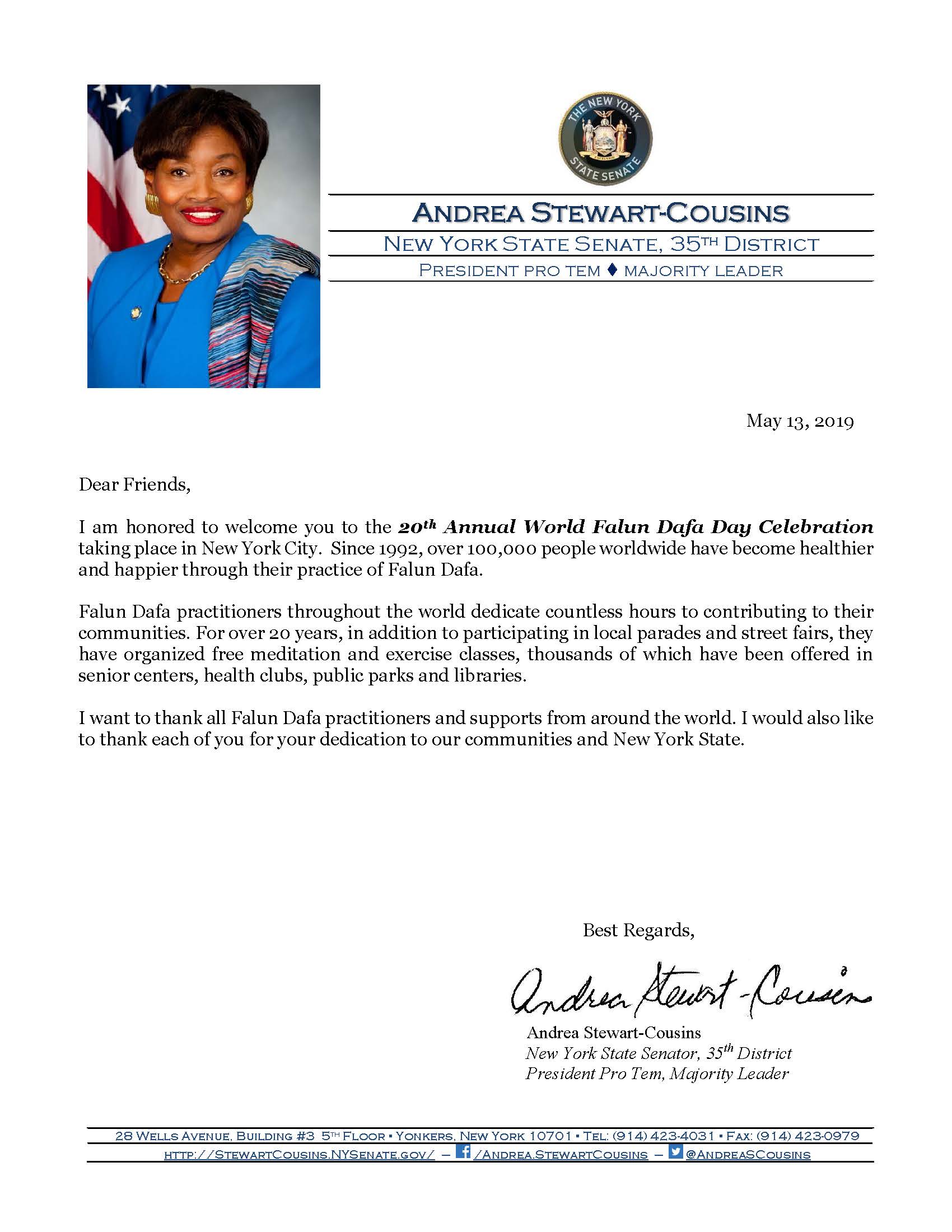 紐約州第三十五選區參議員安德里亞﹒斯圖爾特-庫桑(Andrea Stewart-Cousins)在賀信中說:「我很榮幸地歡迎你們在紐約市舉行的第二十屆世界法輪大法日的慶典。」