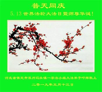 河北省保定市涿州碼頭鎮一學法小組大法弟子恭祝慈悲偉大的師尊華誕!普天同慶5.13世界法輪大法日!