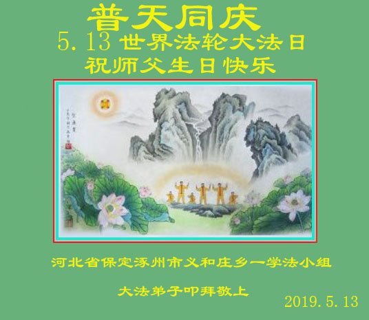 河北省保定涿州市義和莊鄉一學法小組大法弟子恭祝慈悲偉大的師尊生日快樂!普天同慶5.13世界法輪大法日!