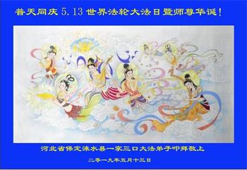河北省保定市定州市一大法弟子全家三代五口恭祝師尊華誕暨世界法輪大法日!
