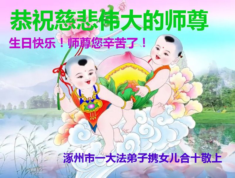 河北保定市涿州市一大法弟子攜女兒恭祝師尊生日快樂!