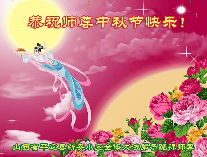 山西省陽泉市平定縣新安小區全體大法弟子恭祝慈悲偉大的師尊中秋節快樂!