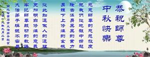 二十個中秋,二十年期盼,二十年的巨大付出和承受。眾生感恩師尊不盡,大法弟子倍加感恩偉大師尊為我們付出的一切。大法弟子在師尊的帶領下經歷了二十年迫害,堅定的走到了今天,令一切邪惡膽寒,令一切生命讚歎。一切全來自法輪大法,來自偉大師尊的無量慈悲。救度眾生中在大法的引導下,在您不捨不棄的慈悲保護下,大法弟子勇猛精進。每當遇到難關時,我們只要以法為師,遵循您的教導去做就能過的去,因為大法是超常的,大法威力無窮。弟子修煉的每一步都離不開大法的指引,每當我們困惑時,每當我們怠懈時,每當我們人心太重時,您總是會點醒我們。您無時無刻守候著我們、保護著我們。是您緊緊拉著我們的手往前奔,人世間實在太險惡,因此我們必須常用大法清洗自己才不會被污染,大法時刻伴隨著我們,早已扎根在我們心中。