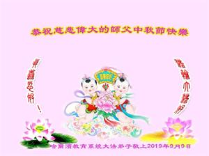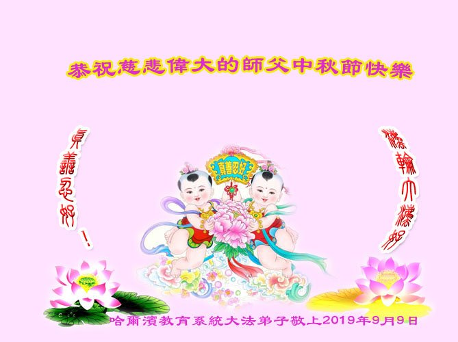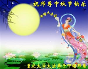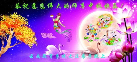 慈悲偉大的師父:中秋節好!是師父的巨大承受,才使我們又迎來了一個團圓、溫馨的中秋,弟子們懷著感恩的心,恭祝恩師中秋佳節快樂!弟子感恩師尊和大法神奇偉大,非為一般言詞所能表達。在正法的最後時刻,我們一定更加努力,踏踏實實的修好自己,抓緊救度眾生,完成史前大願,跟師父回家。讓我們無愧於「正法時期大法弟子」這個宇宙中最崇高而神聖的稱號!