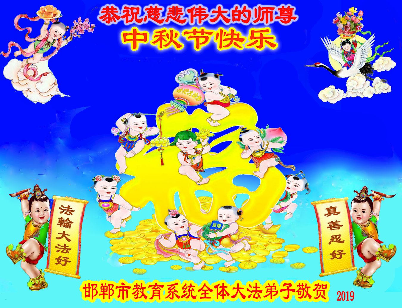 在2019年中秋節即將到來之際,感恩師尊慈悲苦度,感恩師尊為弟子們的付出承受,弟子們才能在大法中修煉、得度,生命才能得以提升,返本歸真,重返家園。師尊您辛苦了!謝謝師尊!在以後有限的時間內,我們要抓緊實修,學好法,趕快提升自己,趕快救人。