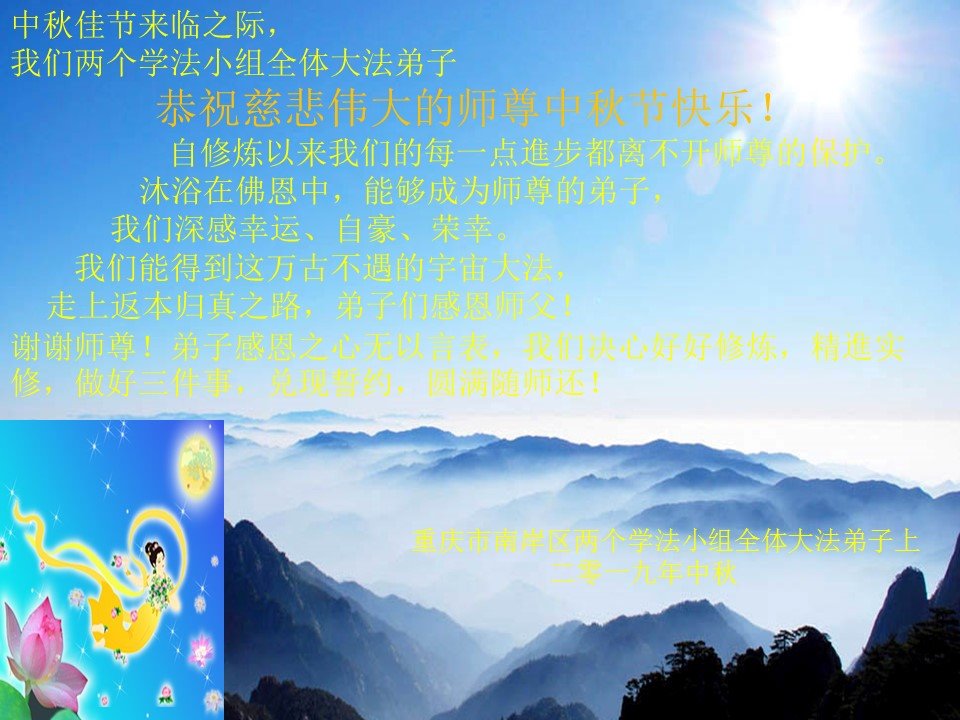 在中秋佳節到來之際,重慶江北區一大法弟子懷著崇敬的心,向慈悲偉大的師尊致以最崇高的敬意!