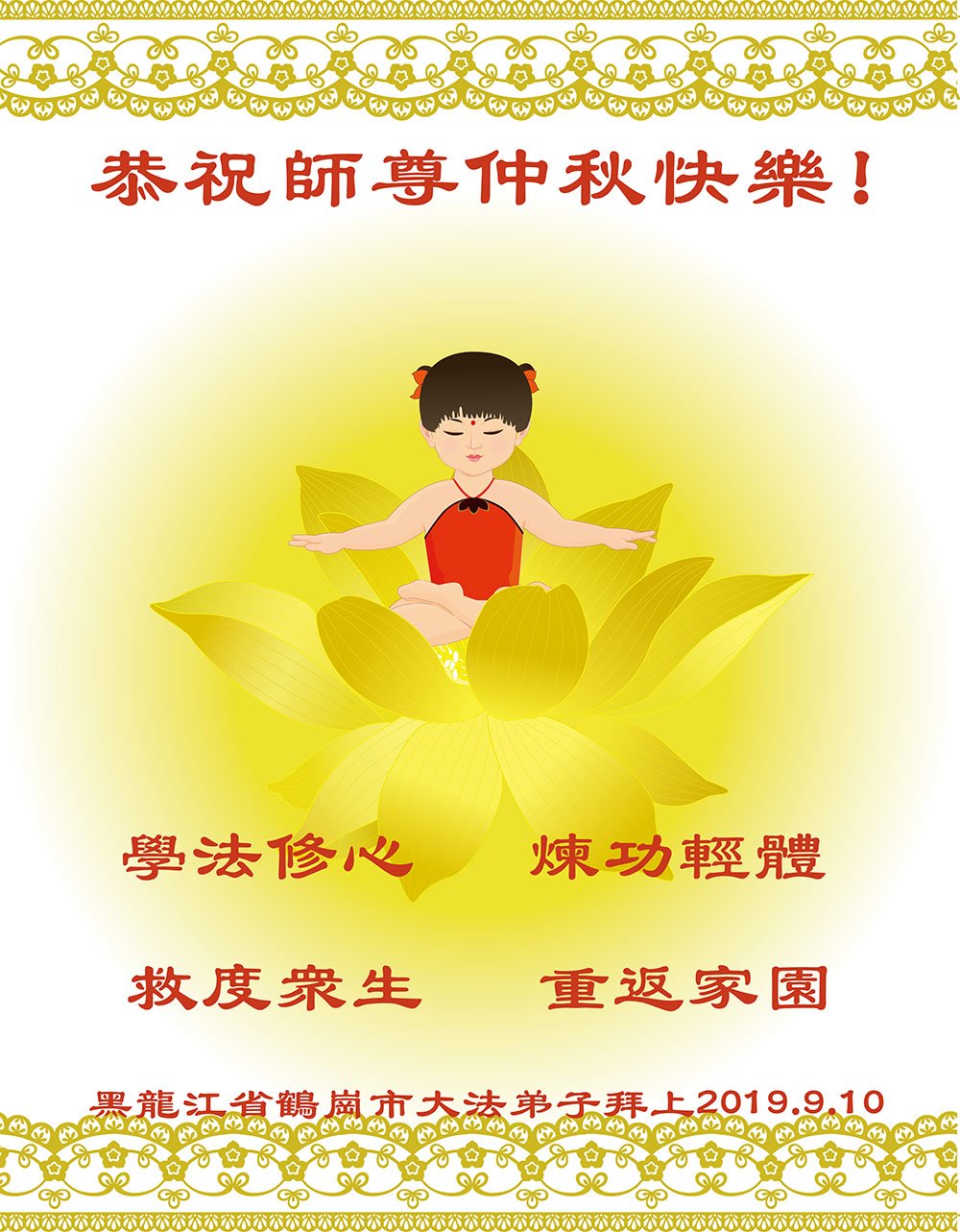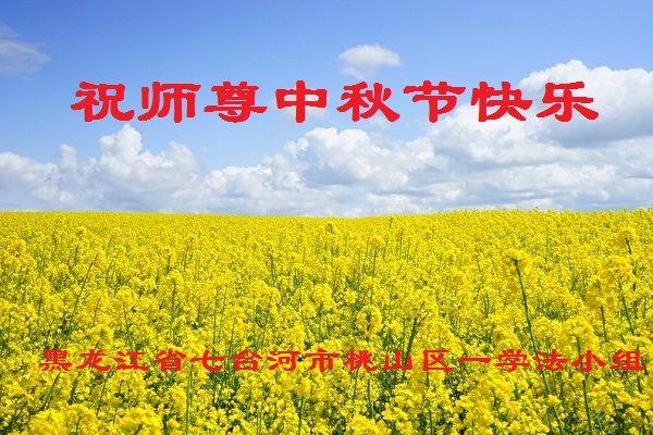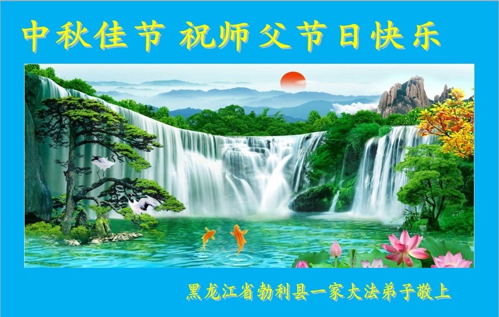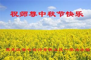 偉大的師尊您好!您辛苦了!師尊謝謝您,把我們從痛苦的苦海中度到了幸福的彼岸。我學法輪大法後受益匪淺,百病皆除,更重要的是明白了人生的真諦。同時家人,人人佩服法輪大法,支持法輪大法,都有不同程度的走入了大法的修煉。法輪大法給我們全家帶來了光明、幸福和平安。為此,我們全家老少四代九人恭祝偉大師尊中秋快樂!