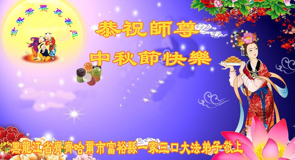 黑龍江省齊齊哈爾市富裕縣一家三位大法弟子恭祝師尊中秋快樂!