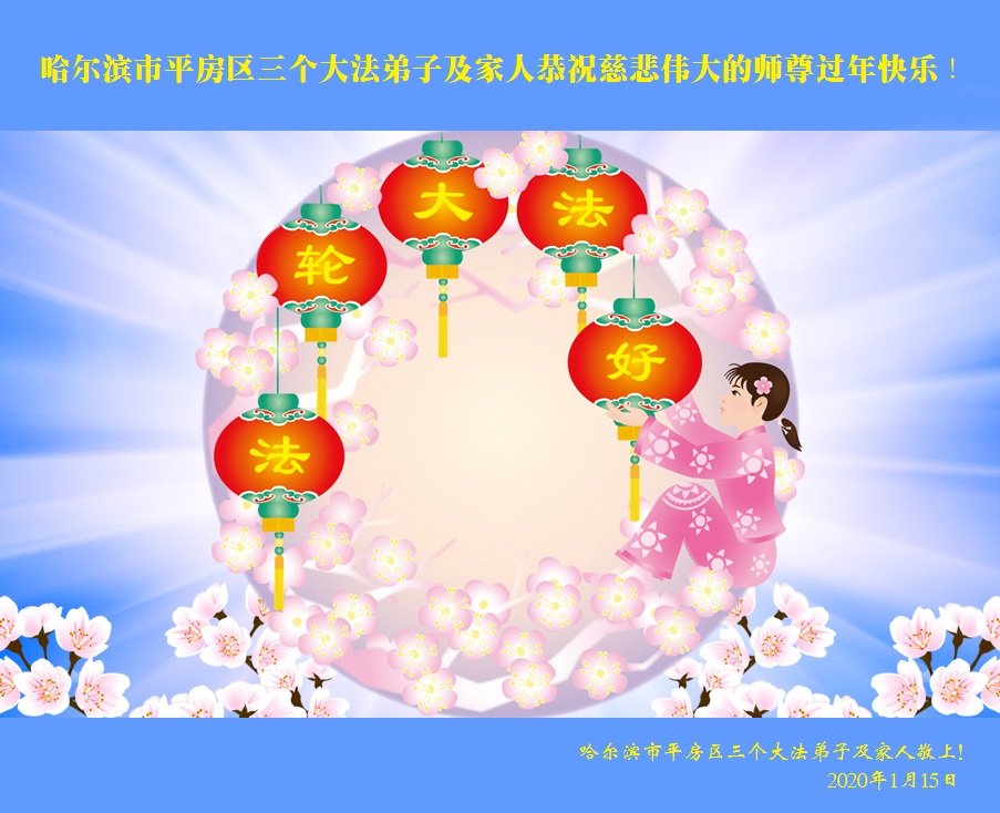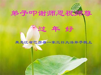 黑龍江省哈爾濱市平房區三個大法弟子及家人恭祝慈悲偉大的師尊過年快樂!