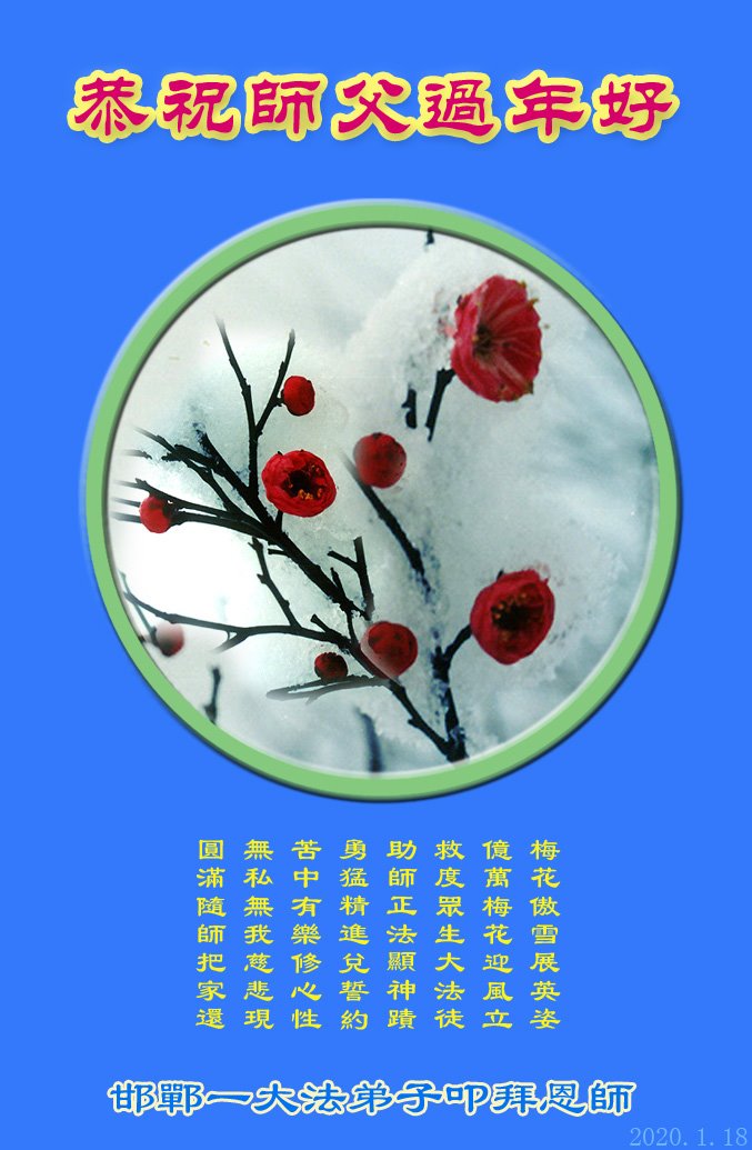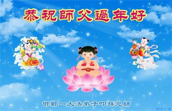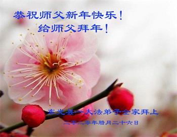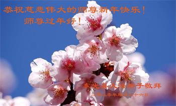 師尊您辛苦了!師尊為救度我們操 盡了心,弟子們用千言萬語都說不盡。弟子們只有聽師尊的,在新的一年裏, 要更加實修做好三件事,請師尊放心。全體大法弟子給師尊拜年。叩拜師尊。