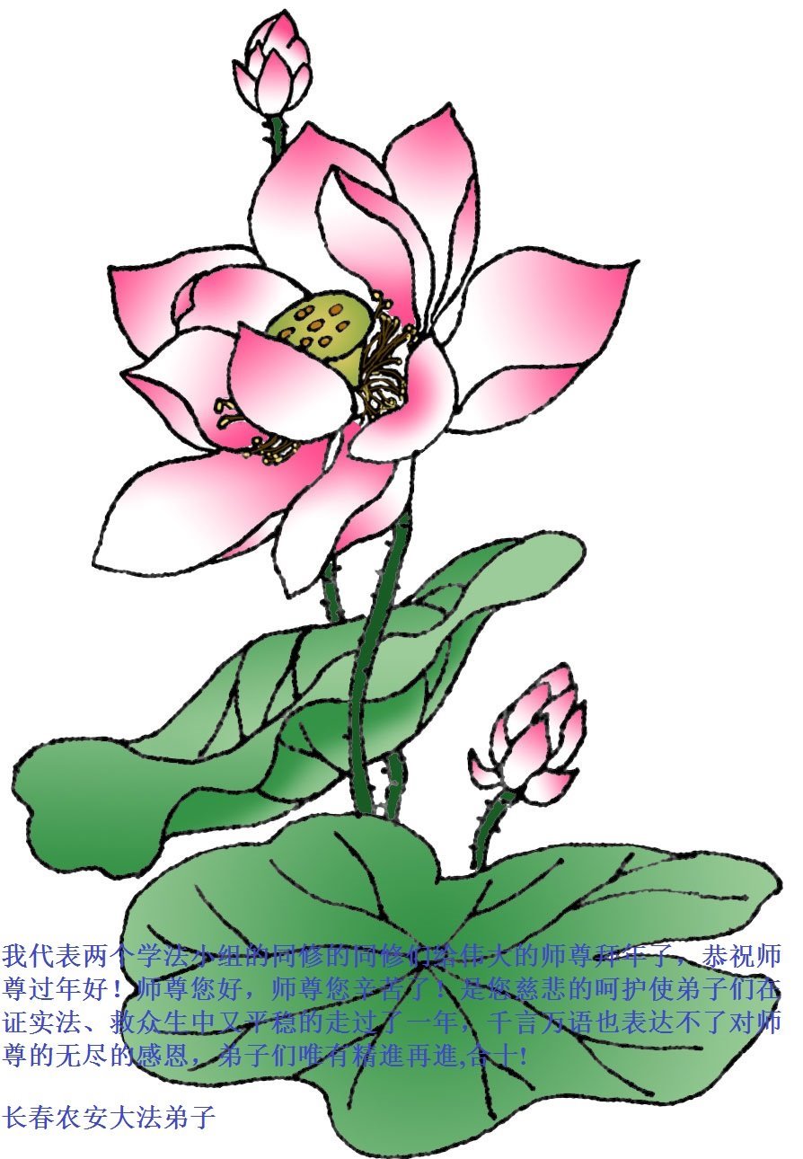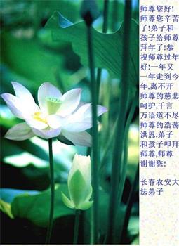 值此中國新年來臨之際,謝謝師父的慈悲救度,使我能夠得法修煉。我一定好好修煉,在新的一年裏更加精進,不辜負師父的慈悲苦度。謝謝師父!在此代表全家人給師尊拜年,恭祝師尊新年快樂!