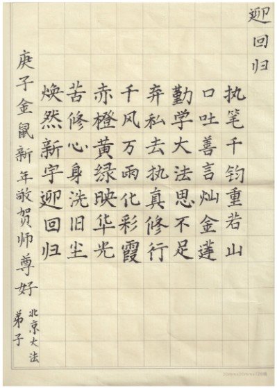 新年將至,弟子想念慈悲偉大的師尊。我們是北京的大法弟子,2019年有一同修至今被非法關押在北京女子監獄。跌倒了再爬起,挫折磨難讓弟子在修煉中學會向內找,學會更理性和成熟。今天,弟子們用一首詩《迎回歸》書法作品表達對師尊的敬意,對修煉到底的決心,感恩師尊!