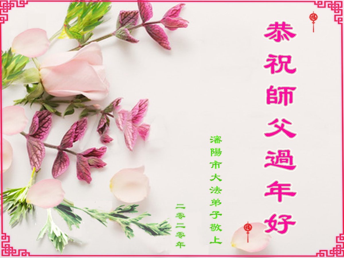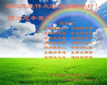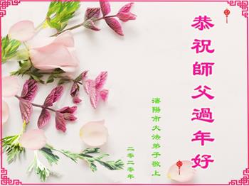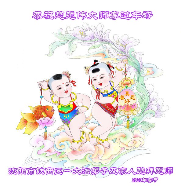 我代表我全家向慈悲偉大的師尊拜年,師父過年好!您辛苦了!我們的一個村子所有的大法弟子向慈悲偉大的師父拜年:師父過年好!我們一定要跟師父走到法正人間的最後一刻,和師父回家。我們一定配合好,做好三件事,完成使命。兌現誓約,就走師父安排的回家路。師父您辛苦了!