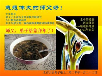 過年了,這是感恩的時刻,感恩師父把我這樣一個平凡而卑微的生命當弟子,苦口婆心的教導我明白人生的真諦;感恩師父替我扛過巨難,使我在偏癱的危機中走了過來;感恩師父幫我在一次又一次的騷擾迫害下平安走過;感恩師父讓我修煉出一顆堅強的心一個高貴的靈魂──嚮往善良,勇於承擔;感恩師父保護了我風雨飄搖的家,使老幼有所養;感恩師父使我增加了學識,明白一點點文明傳承應有的素養……說不盡的感恩啊。