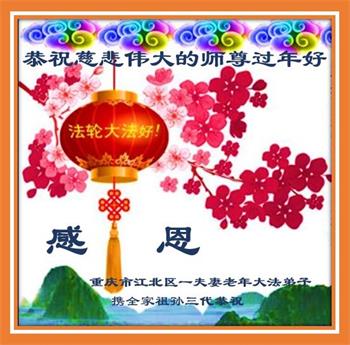 重慶市江北區一老年夫妻大法弟子攜全家祖孫三代給師尊拜年!恭祝慈悲偉大的師尊過年好!