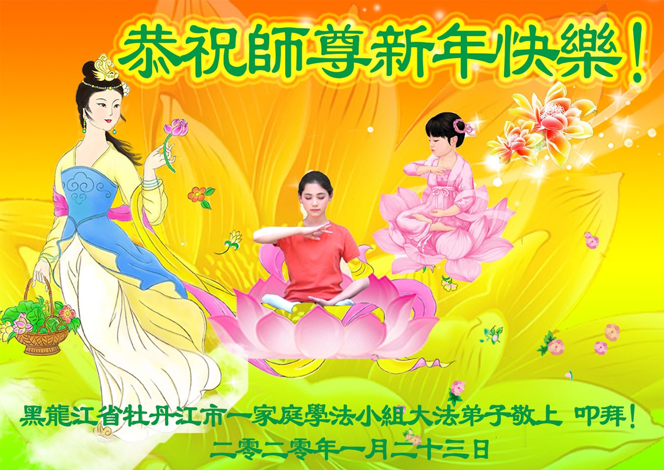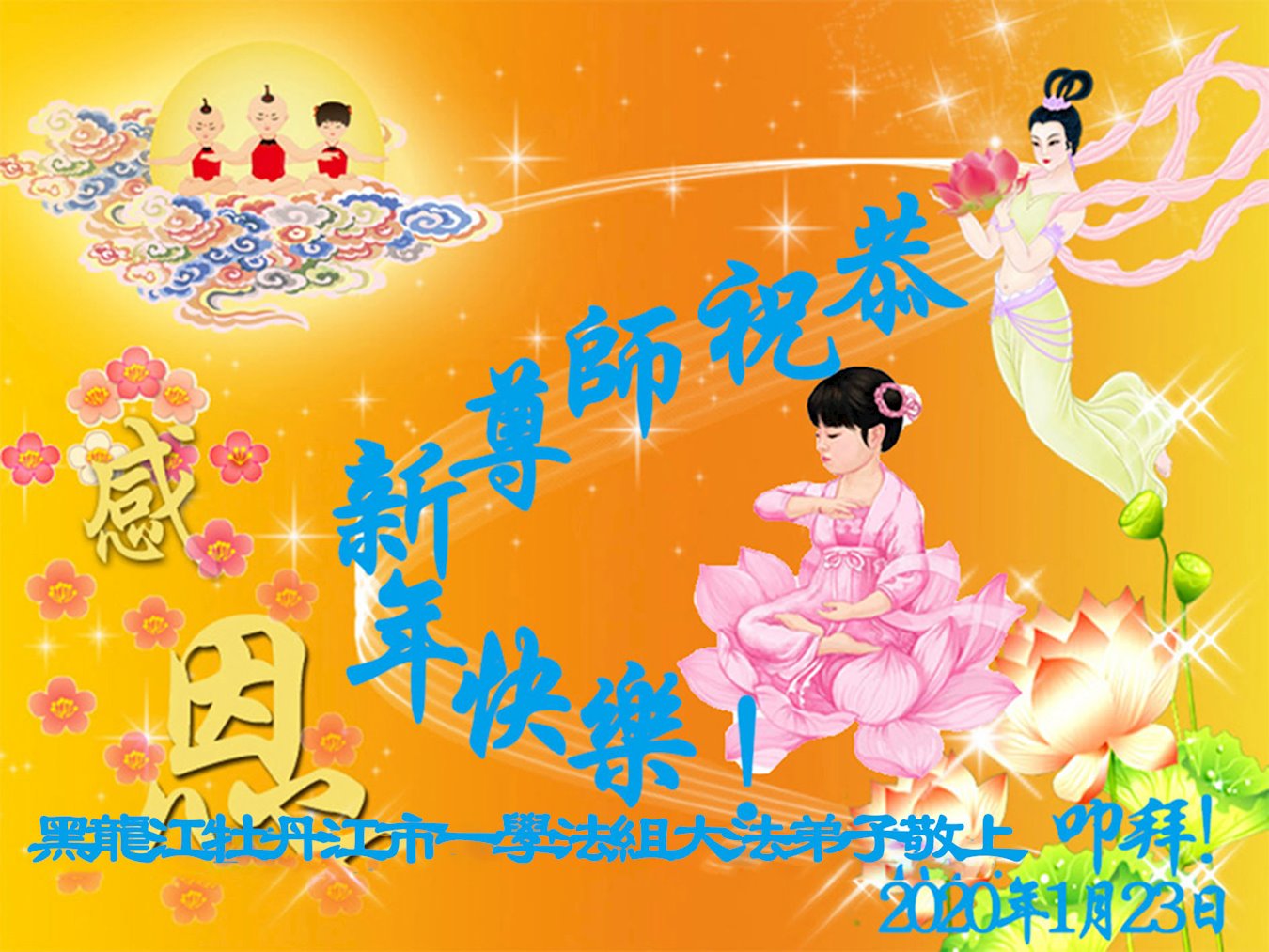 恭祝師尊新年快樂!並在新的一年裏:勇猛精進;不負師望;做好三件事;修好自己;兌現誓約;圓滿隨師還!