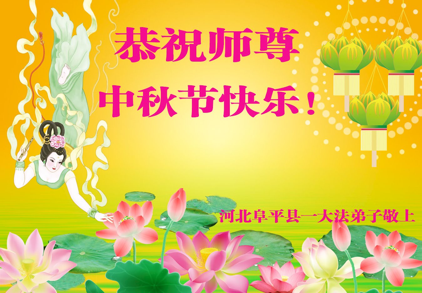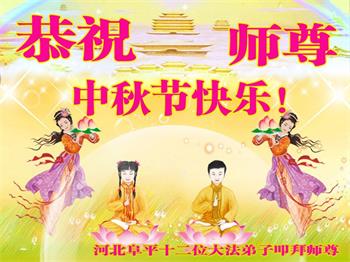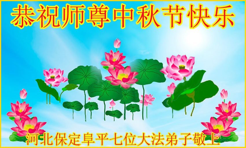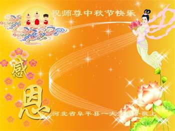 河北省保定容城縣大法弟子祝師尊中秋節快樂!盼師父早日回國與弟子團聚,師父為弟子付出太多太辛苦了,謝謝師父。我一定聽師父的話,做好三件事,多救人,讓師父多些安慰,少些操勞。再祝師尊中秋快樂!