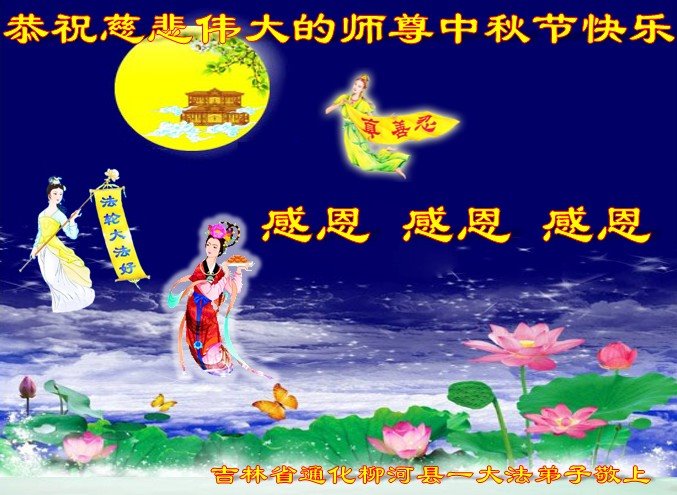 首先我和同修祝師尊中秋節快樂!感謝師尊多年來的慈悲救度!感謝師尊傳大法救度宇宙中的眾生,把「真、善、忍」的甘露撒向世界各國,教人向「善」使上億人道德回升,身心受益,您為眾生操盡了心,為眾生歷盡巨大的魔難與承受,我們再次深深的向師尊說一聲:師尊您辛苦了!弟子無限感恩!感恩!感恩!叩謝師尊!合十!