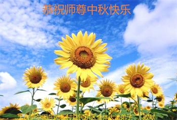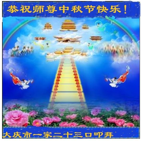 我們是黑龍江省大慶市讓胡路區鑫園小區、明園小區、西寨小區、陽光佳苑小區、長青小區、陽光嘉城小區、廣廈小區、明胡花園小區等8個小區的全體大法弟子向慈悲偉大的師尊的問候,祝師尊中秋節快樂!師尊您辛苦了!感恩師尊慈悲苦度!