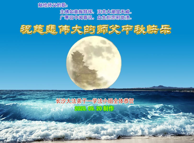 中秋是闔家團圓的日子,我們瀏陽市全體大法弟子非常想念慈悲偉大的師尊,感恩師尊的慈悲苦度!「操盡人間事、勞心天上苦」,宇宙正法,師尊辛苦了!祝師尊中秋節快樂!弟子們會用神的正念走好最後的每一步!圓滿隨師還。瀏陽市全體大法弟子敬上!