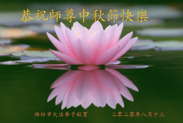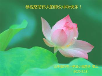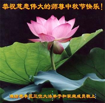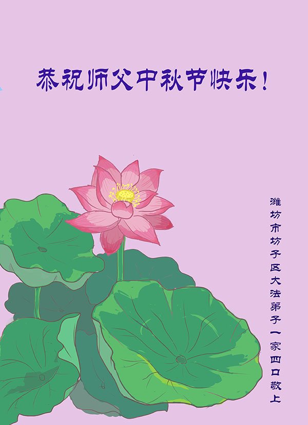 尊敬的師父您好!弟子跪拜師父!感恩您洪大的慈悲!能夠做您的弟子,我感到無比的榮耀。弟子一定認真學法,讓世人感受到大法的神奇與美好,做好大法弟子救世人的使命,讓更多的世人能夠受到大法的福澤,得到師父的救度。值此中秋佳節之際,弟子攜家人跪拜師父!祝慈悲偉大的師父節日快樂!