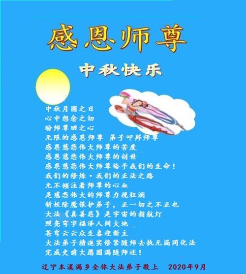 師父辛苦了!值此中秋佳節,恭祝慈悲偉大的師尊節日快樂!弟子今生幸得大法,幸得師尊慈悲救度,唯有無盡的感恩!唯有做好「三件事」返本歸真,跟師父回家。
