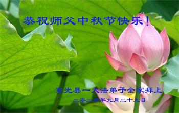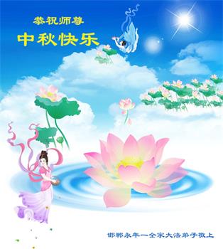 尊敬的師父好:首先我和全家恭祝師尊中秋節快樂!從得法到現在無數次的跌倒爬起,都是在師父慈悲保護下走過來的,這些年來我和家人身邊發生的一些神奇事足以證明大法的美好。對師父的感恩無法用語言表達,弟子唯有多學法,精進實修,從法中提高上來,跟上正法進程,感謝師父救度之恩。