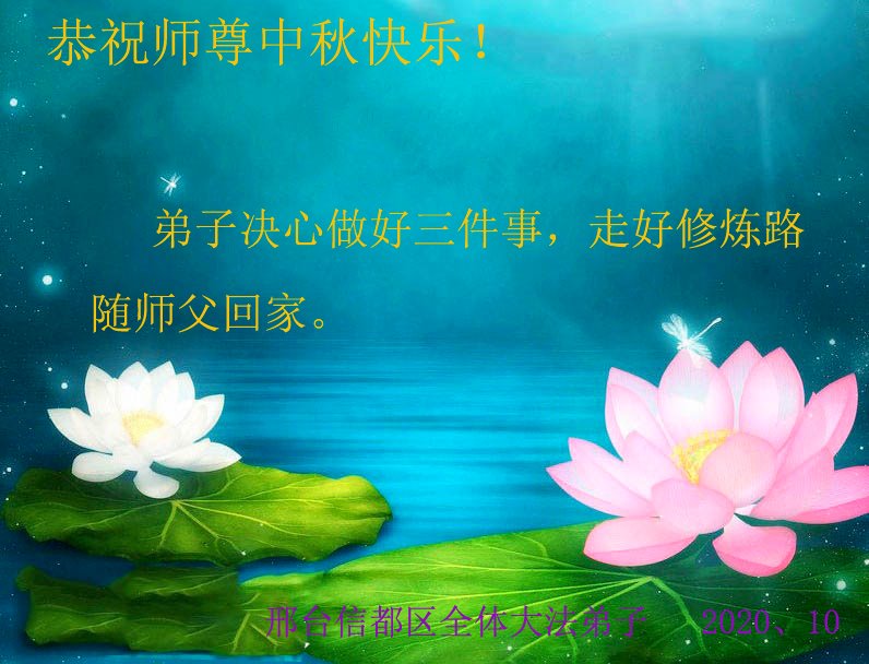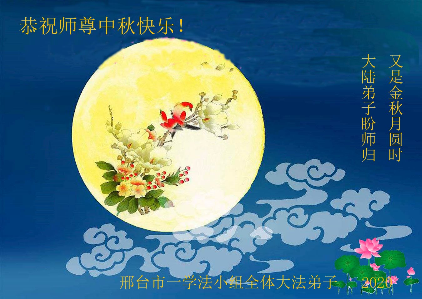 在2020年中秋佳節即將到來之際,河北省平鄉縣全體大法弟子祝願師尊中秋佳節快樂!我們雖與師尊遠隔重洋,但我們知道師尊就在我們身邊無微不至的保護著弟子,我們的心永遠與師尊在一起!