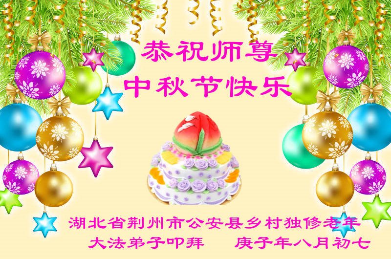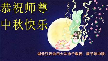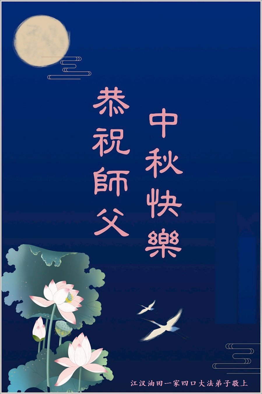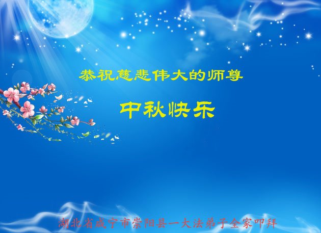 我是湖北省咸寧市崇陽縣一大法弟子,在這一年一度的中秋佳節即將來臨之際,我首先代表我們全家恭祝慈悲偉大的師父中秋快樂!感恩師父對我們全家所有人的眷顧,我們家人都在大法的護佑下得了福報。感謝師父一次次救弟子於危難之中,師恩難報,我只有做好三件事,修好自己多救人,讓師父少操心,最後跟師父回家!