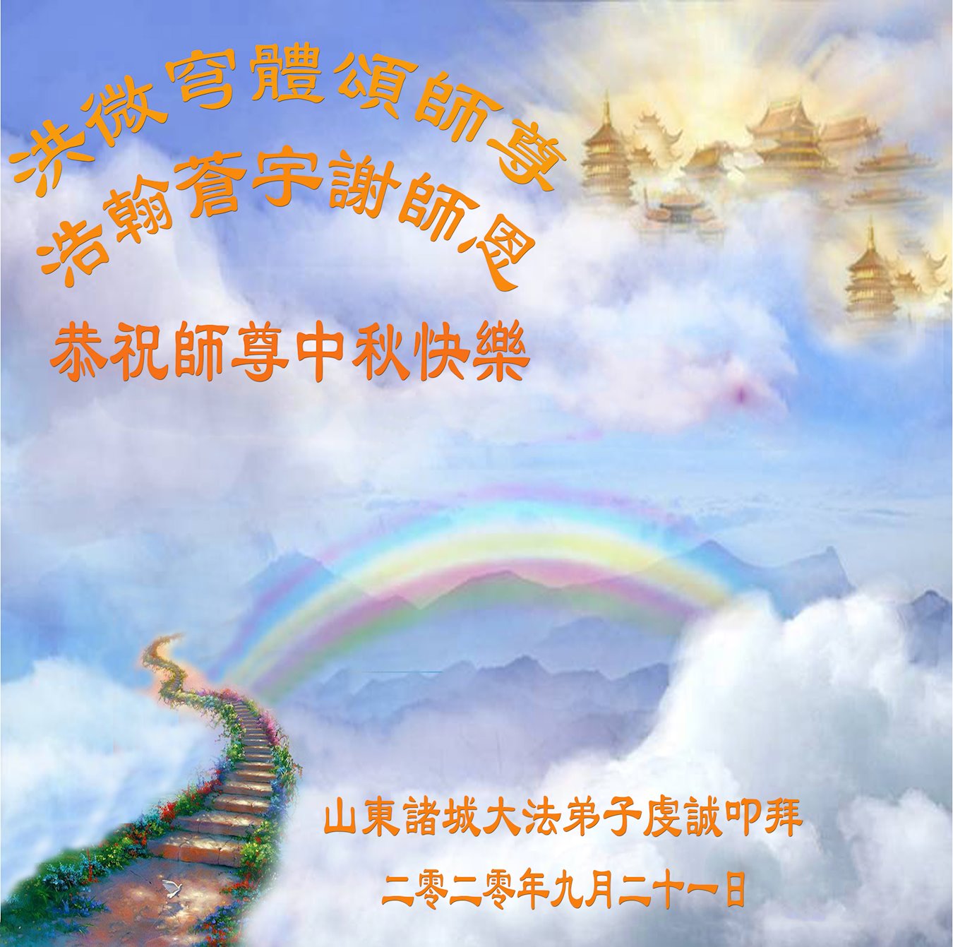 在二零二零年中秋節來臨之際,弟子們恭祝慈悲偉大的師尊中秋節快樂!師尊您辛苦了!弟子想念師父!我們要精進實修,多學法,發好正念,多救眾生,決不辜負師尊的慈悲苦度,盼望和師尊團聚的那一天早日到來。
