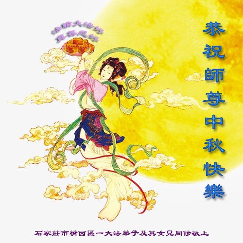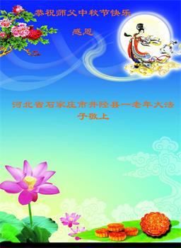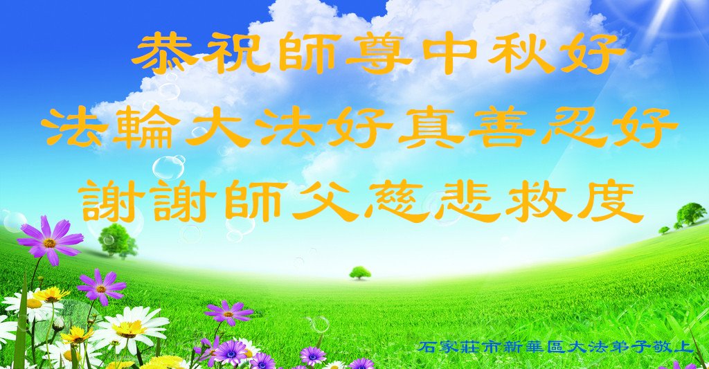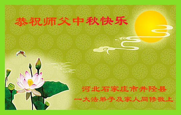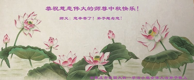在中國傳統的中秋節來臨之際,石家莊市鹿泉的大法弟子恭祝慈悲偉大的師尊中秋節快樂!道一聲師父您辛苦了!為了弟子及眾生能有一個美好的未來,您承擔了無量的罪業,弟子唯有再精進,做好三件事,不辜負師父的慈悲救度,圓滿隨師還。