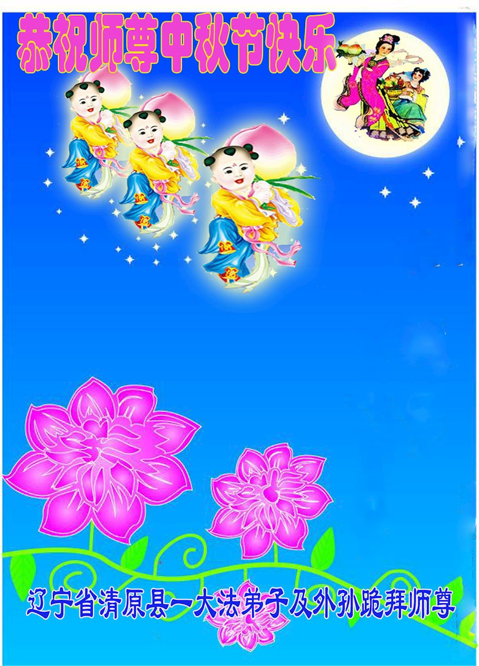 我們是遼寧撫順望花的兩名大法弟子,值此中秋之際,雖不能見到師尊,藉此表達弟子的思念和感恩。弟子會記住師尊的教誨,不斷修正自己,救度更多的眾生。