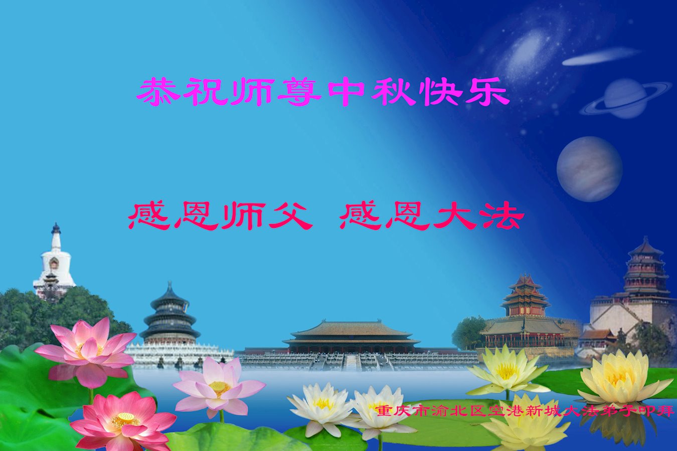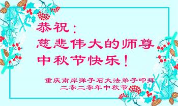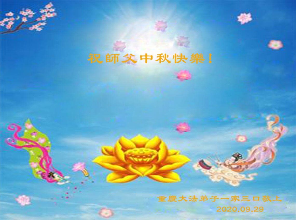 重慶永川區一家大法弟子:恭祝慈悲偉大師尊中秋節快樂!弟子唯有做好三件事,修好自己,多救人,惟願師尊笑,珍惜這萬古機緣,圓滿隨師還!